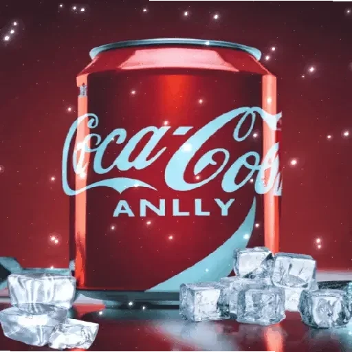 Uma lata de Coca-Cola com gelo em volta, fundo vermelho com estrelas brilhantes. A lata tem o logotipo da Coca-Cola e o texto 'ANLLY' embaixo.