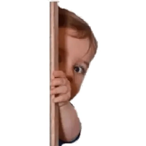 Menino espiando por trás de uma barra de madeira, com uma expressão curiosa e mão segurando a barra.