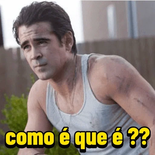 Homem com expressão confusa e suado, vestindo uma camiseta branca, com o texto 'como é que é ??' em amarelo na parte inferior.