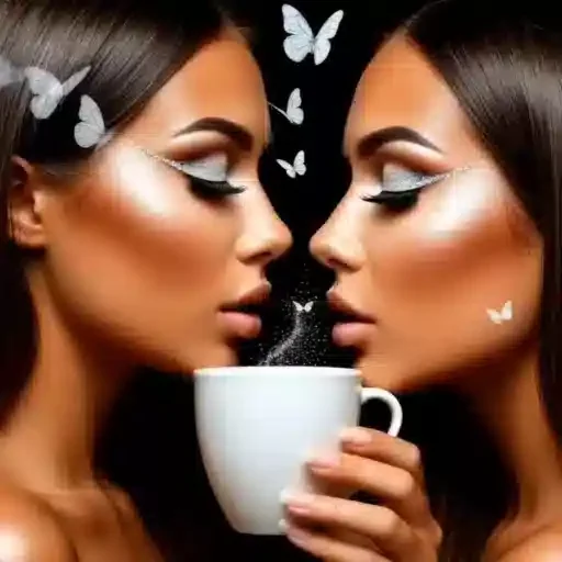 Rosto de mulher com batom vermelho e cabelo preto, olhando para o lado com uma mecha de cabelo na frente do rosto.