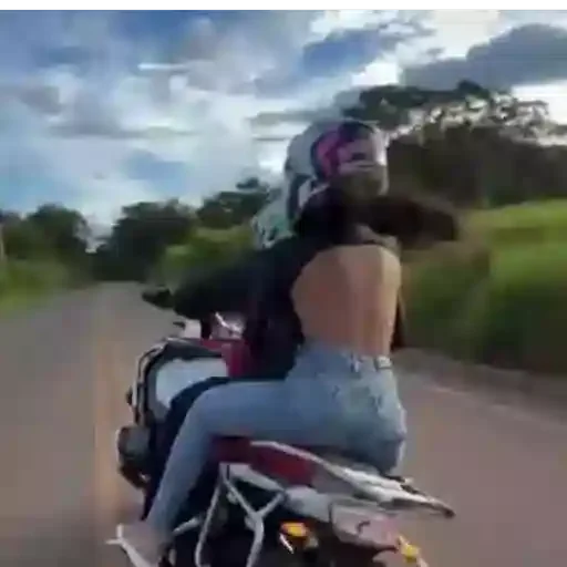 Mulher de cabelos pretos e longos, usando um capacete e uma blusa preta, sentada em uma motocicleta vermelha e branca, andando em uma estrada com céu nublado.