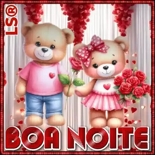 Dois ursinhos de pelúcia, um macho e uma fêmea, com corações e flores vermelhas, desejando boa noite. O ursinho macho veste uma camiseta rosa e jeans, enquanto a fêmea usa um vestido rosa e uma faixa na cabeça.
