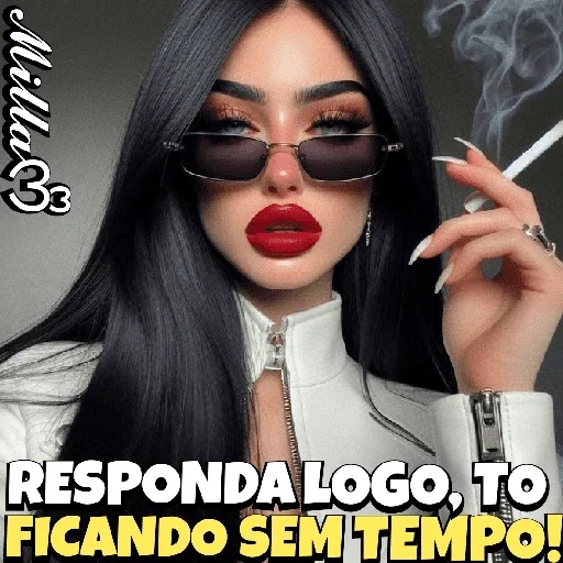 Mulher de cabelo preto, óculos de sol, batom vermelho e jaqueta branca, fumando um cigarro com a mão esquerda. 'RESPONDA LOGO, TO FICANDO SEM TEMPO!'