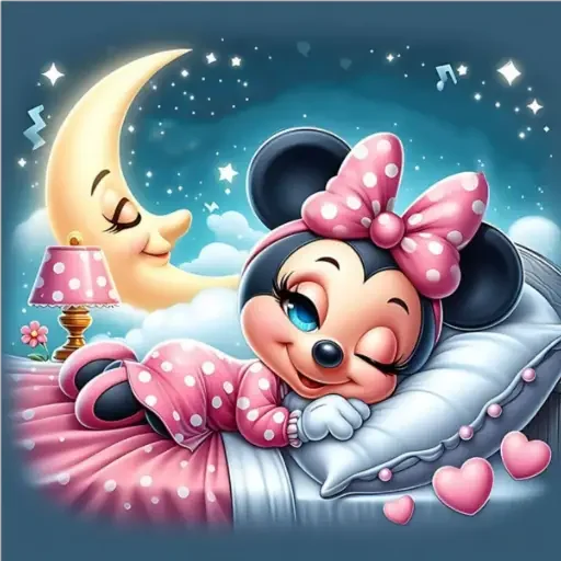 Mickey Minnie dormindo na cama com uma lua sorridente ao fundo, vestindo um pijama rosa com pontos brancos e uma faixa rosa com pontos brancos no cabelo.