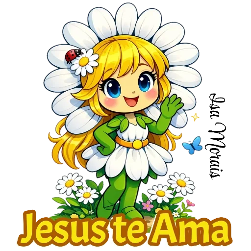 Uma menina de cabelos loiros com uma flor na cabeça e um vestido de flores, com o texto 'Jesus te Ama' embaixo. Ela tem um sorriso no rosto e uma mão levantada.