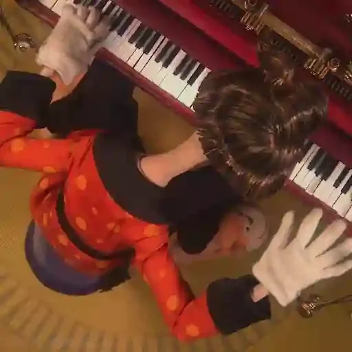 Um menino com cabelo castanho e óculos está caído no chão ao lado de um piano vermelho, vestindo uma camisa laranja com pontos laranjas e uma luva branca na mão direita.