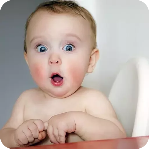 Bebê com expressão de surpresa, boca aberta e olhos arregalados, sentado em uma cadeira com fundo cinza e branco.