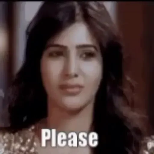 Rosto de uma mulher com cabelo castanho e expressão séria, pedindo 'Please'.