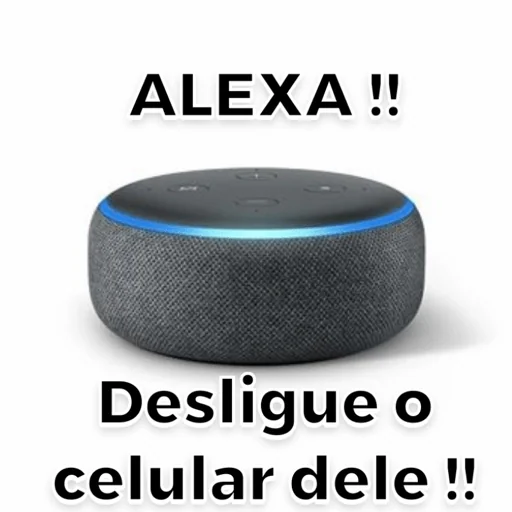 Uma imagem de um dispositivo Amazon Echo com uma faixa de luz azul, com o texto 'ALEXA!! Desligue o celular dele !!' em letras pretas.
