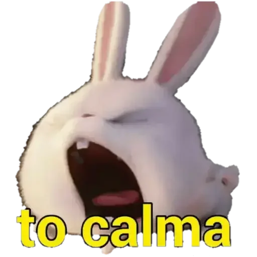 Um coelho branco com orelhas grandes e olhos semicerrados, com a boca aberta e a expressão 'to calma' em letras amarelas.