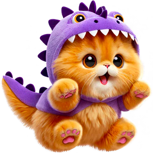 Gatinho laranja com olhos grandes e focinhos brancos vestindo uma fantasia roxa de dinossauro com espinhos e dentes, com a língua para fora.