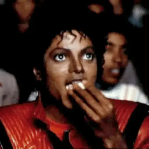 Michael Jackson com um cigarro na boca, vestindo uma jaqueta vermelha e preta, com expressão surpresa.
