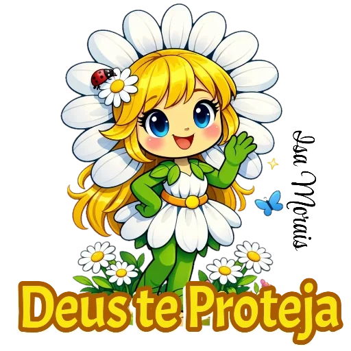 Uma menina de cabelos loiros vestida de flor, com uma joaninha em seu cabelo e um sorriso no rosto. Ela está cercada por flores e a frase 'Deus te Proteja' está escrita abaixo dela.
