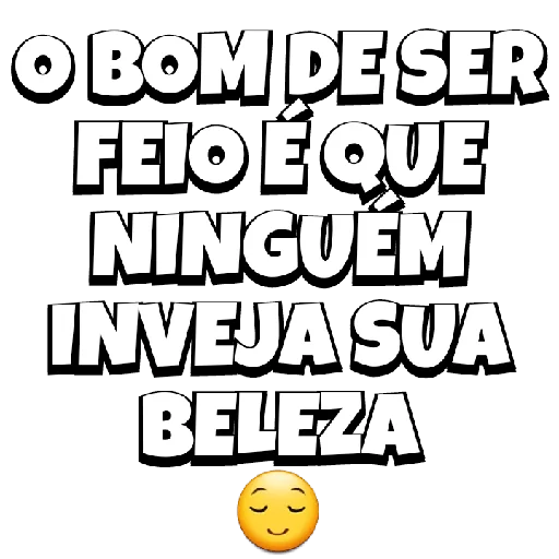 Um texto em branco e preto com uma linha de texto que diz 'o bom de ser feio é que ninguém inveja sua beleza' e um emoji de rosto sorridente no final.