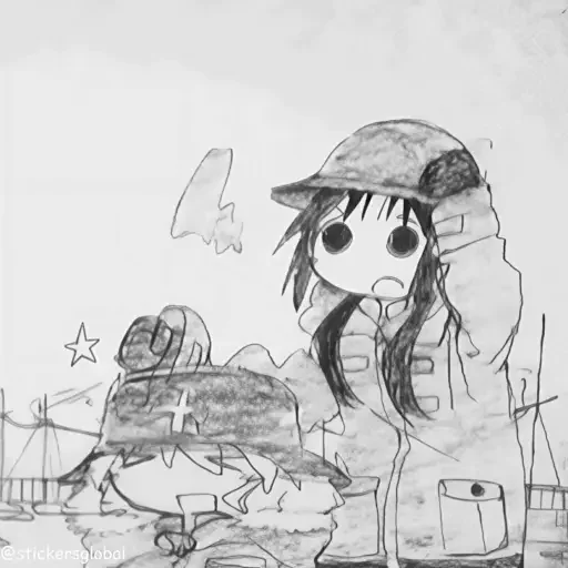 Garota com expressão surpresa usando um boné e jaqueta, com um tanque ao fundo e estrelas.