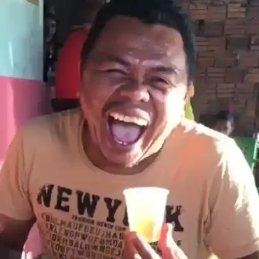 Homem com expressão engraçada, língua para fora, segurando um copo, com uma camisa que diz 'NEW YORK'.