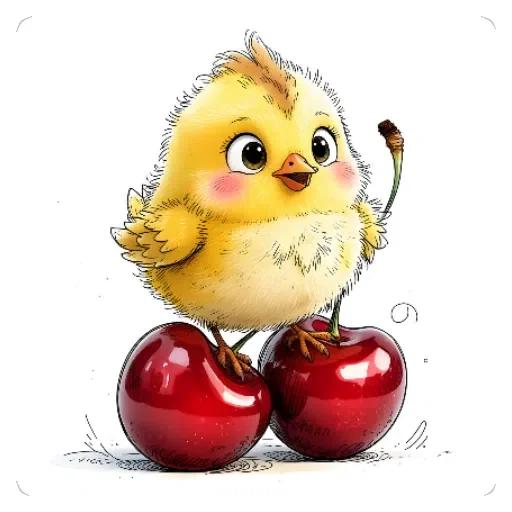 Um filhote de galinha amarelo fofinho está em pé sobre duas cerejas vermelhas brilhantes, com olhos grandes e rosados nas bochechas.
