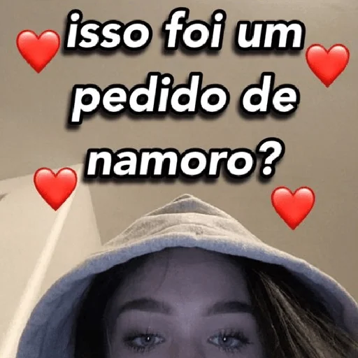 Uma mulher com capuz olha para a câmera com uma expressão curiosa, enquanto a frase "isso foi um pedido de namoro?" aparece acima dela, rodeada de corações vermelhos.