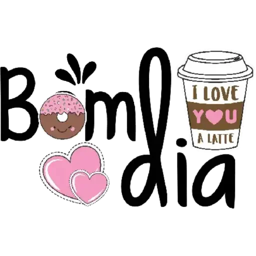 Um 'Bom dia' com ilustrações de um donut rosa, dois corações rosa e um copo de café com a frase 'I love you a latte'.