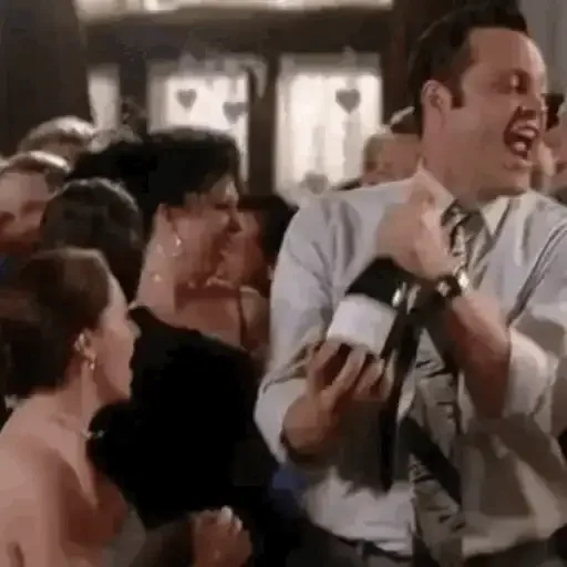 Homem sorrindo e dançando em uma festa, com uma garrafa de vinho na mão.