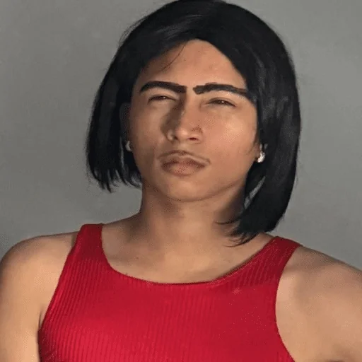 Mulher jovem com cabelo preto curto e tanque vermelho, expressão neutra.