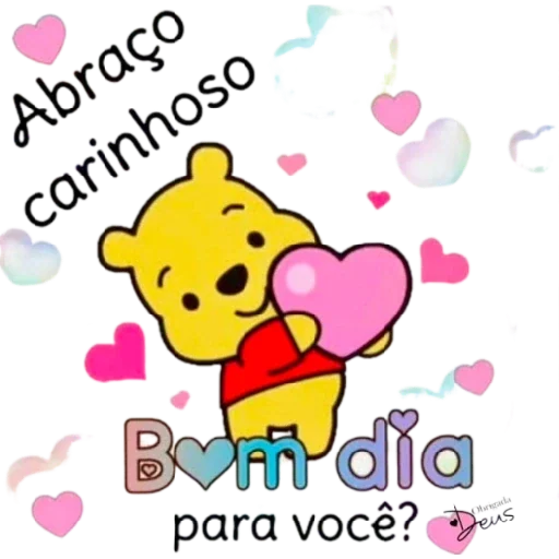 Um desenho do ursinho Winnie the Pooh com um coração rosa, rodeado de corações coloridos. O texto 'Abraço carinhoso Bom dia para você?' está escrito em preto.
