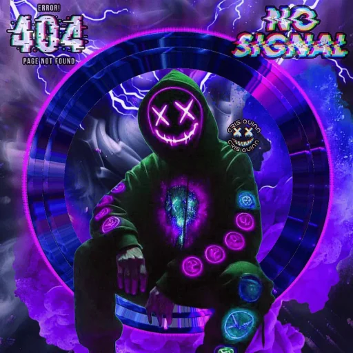 Um personagem em uma jaqueta preta senta-se diante de um fundo roxo e azul com um círculo rosa ao redor. O rosto do personagem tem um desenho de uma cara com olhos em X e boca sorridente, iluminado em rosa. Há textos '404' e 'NO SIGNAL' no canto superior.