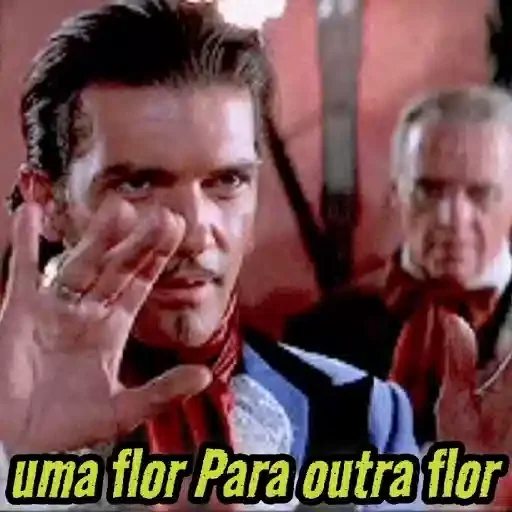 Um homem com cabelo castanho e um colete azul faz um gesto com a mão direita enquanto outro homem mais velho e de cabelo grisalho olha ao fundo. A legenda em amarelo lê 'uma flor Para outra flor'.