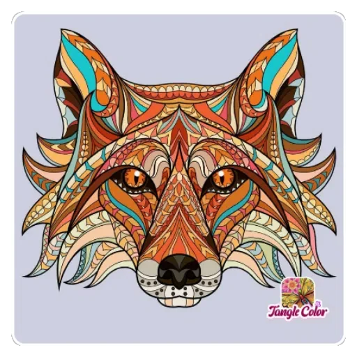 Cabeça de lobo com detalhes coloridos e tribais, olhos laranjas e fundo cinza. A imagem contém um logotipo 'Jungle Ciber' no canto inferior direito.