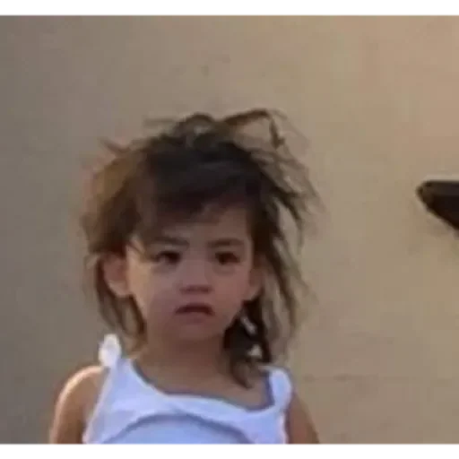 Menina pequena com expressão de surpresa ou preocupação, cabelo desarrumado e camiseta branca.