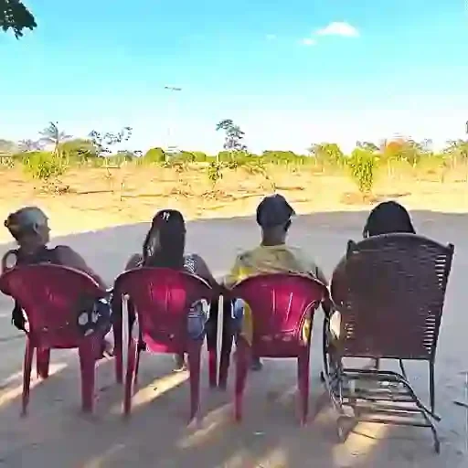 Três pessoas sentadas em cadeiras de plástico vermelho, de costas para a câmera, em um cenário ao ar livre com vegetação seca e céu azul.