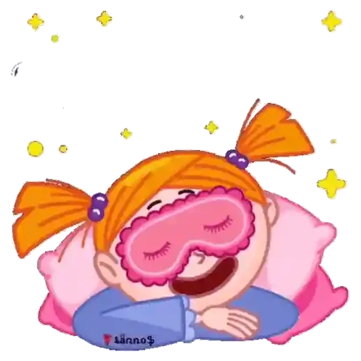Menina de cabelos laranjas em duas tranças dormindo com máscara de dormir rosa e pijama azul, em uma almofada rosa, com estrelas amarelas ao redor.
