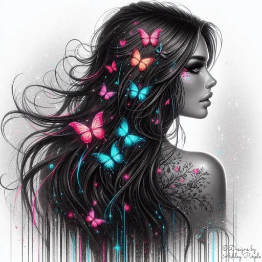 Uma mulher com cabelos longos e escuros, decorados com borboletas coloridas rosa, laranja e azul. Ela tem um tattoo no ombro e os cabelos soltos ao vento.