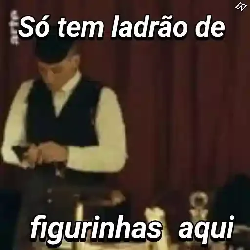Um homem de meia-idade, com um chapéu preto e um colete preto sobre uma camisa branca, está mexendo em algo com as mãos. Ele está diante de uma cortina vermelha. A imagem tem o texto 'Só tem ladrão de figurinhas aqui'.