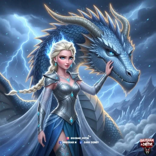 Uma mulher loira com armadura prateada e capa azul ao lado de um dragão azul com chifres dourados, em um cenário de tempestade com raios.