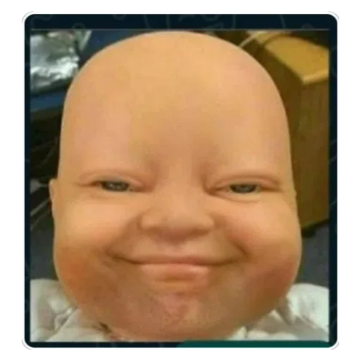 Rosto de bebê careca com sorriso largo e olhos castanhos, parecendo feliz e contente.