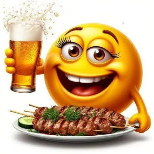 Um emoji amarelo sorridente com um copo de cerveja espumante e um prato de espetinhos grelhados com ervas, em um fundo branco.