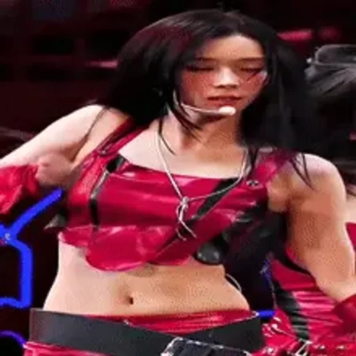 Uma mulher com cabelo azul e top vermelho, branco e azul, em um ringue de luta, com um árbitro ao fundo.