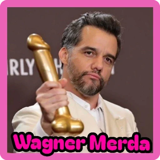 Um homem com cabelo castanho e barba, vestido com um blazer bege, segura um troféu dourado e sorri. Ele está em frente a um fundo escuro com letras brancas. A imagem tem uma borda rosa e o texto 'Wagner Merda' na parte inferior.