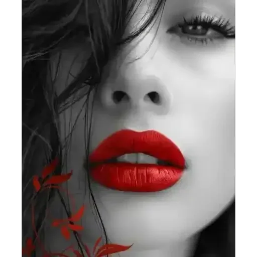 Rosto de mulher com batom vermelho e cabelo preto, olhando para o lado com uma mecha de cabelo na frente do rosto.