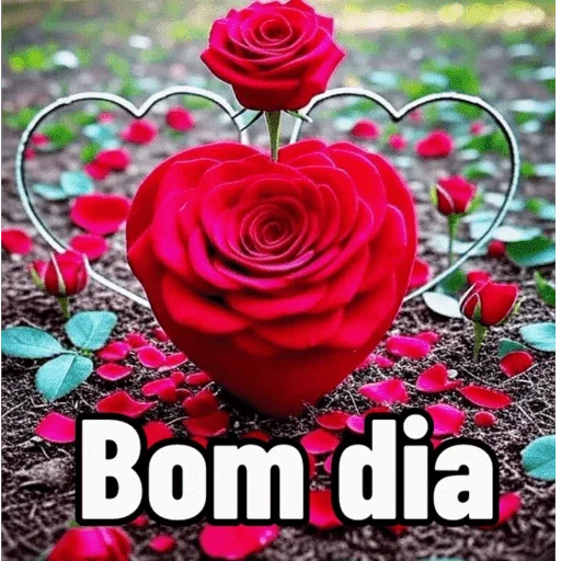 Rosa vermelha em forma de coração com outra rosa e pétalas ao redor, texto 'Bom dia' em branco.