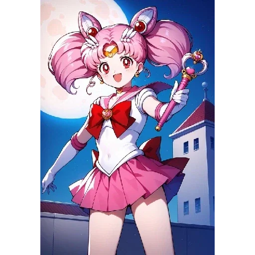 Uma garota de anime com cabelos rosa em pigtails e um laço vermelho no peito, vestindo uma saia rosa e uma luva branca, segura um objeto colorido na mão direita, com uma casa e a lua cheia ao fundo.