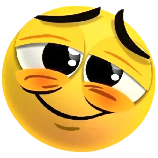 Rosto de emoji amarelo com sobrancelhas pretas e expressão de desconfiança ou surpresa, com bochechas rosadas e sorriso leve.