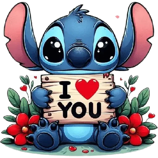 Stitch, personagem de Lilo & Stitch, segurando uma placa de madeira com o texto 'I <3 YOU' em meio a flores vermelhas e folhas verdes.