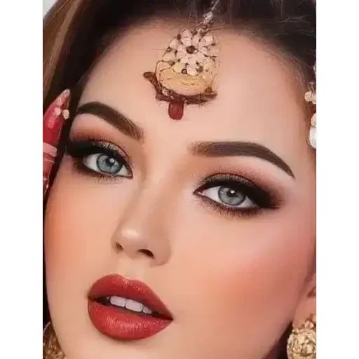 Rosto de uma mulher com maquiagem elaborada, usando um acessório na testa e joias nos ouvidos.