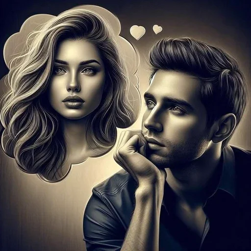 Um homem com a mão no queixo olha para uma mulher na sua mente, com dois corações saindo da sua cabeça. A imagem tem tons de preto, branco e cinza.