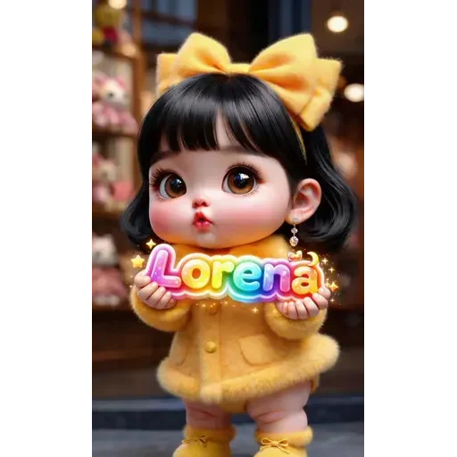 Menina de olhos grandes e cabelo preto com franja, vestida de amarelo e com um laço amarelo no cabelo, segura uma placa colorida com o nome 'Lorena'.