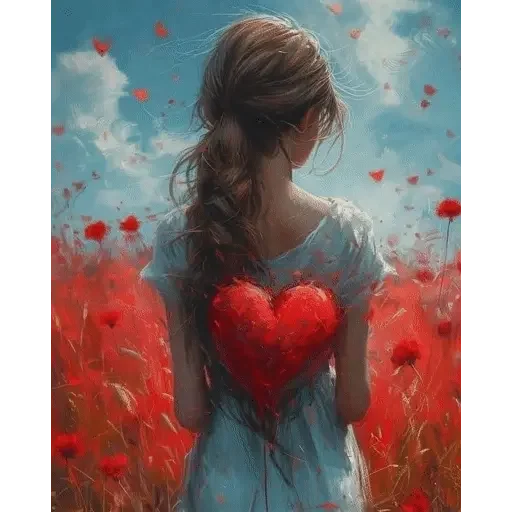 Mulher de costas, com um coração vermelho na frente do vestido, em um campo de flores vermelhas sob um céu azul com nuvens.