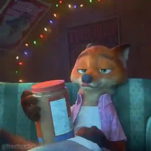 Um personagem de desenho animado de uma raposa marrom com expressão séria, usando um roupão roxo, segurando um pote de manteiga de amendoim com um rótulo branco e uma tampa vermelha, sentado em um sofá verde, com luzes de Natal coloridas ao fundo.