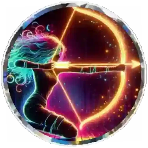 Uma figura feminina com cabelos ondulados em tons de azul e rosa dispara uma flecha de energia em um fundo estelar escuro.